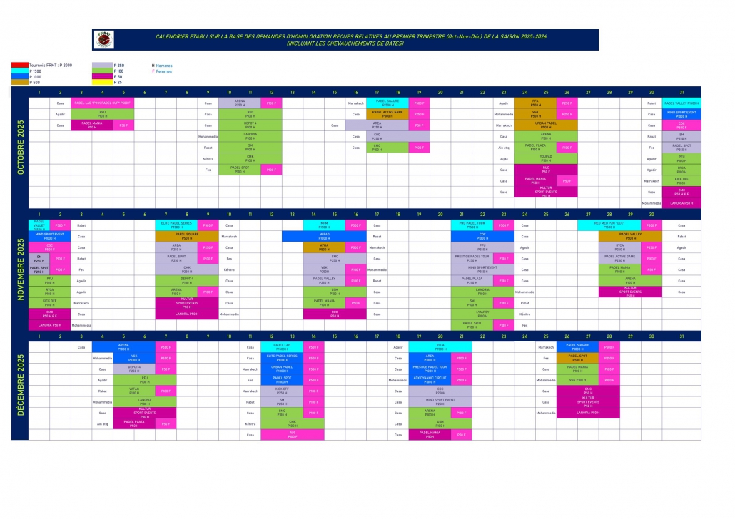 Calendrier des Tournois Padel 1er trimestre de la saison 2025-2026