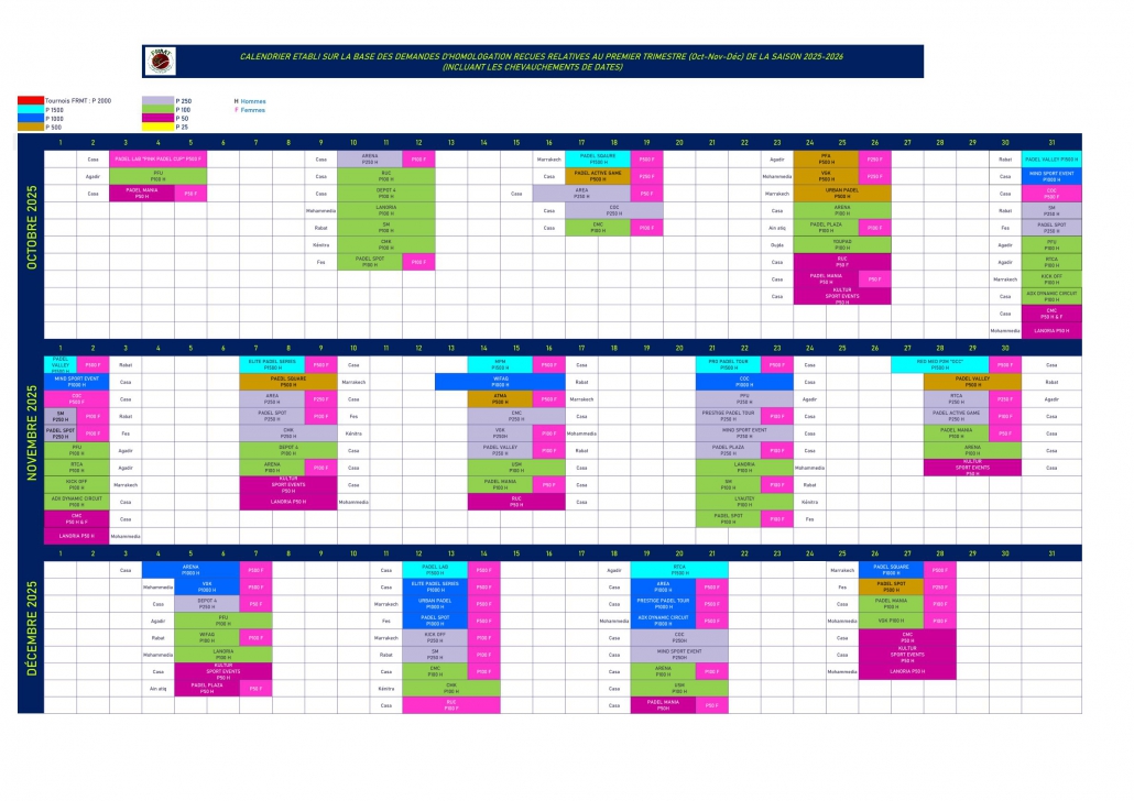 Calendrier des Tournois Padel 1er trimestre de la saison 2025-2026
