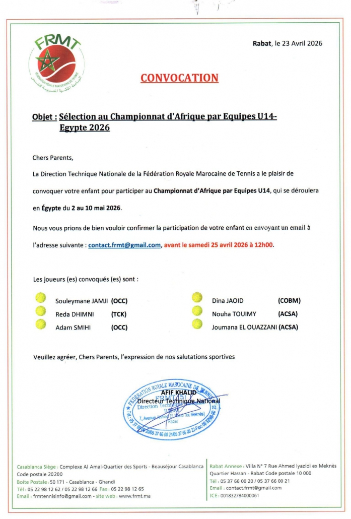 Convocation_Selection au Championnat d’Afrique Par Equipes U14-Egypte 2026