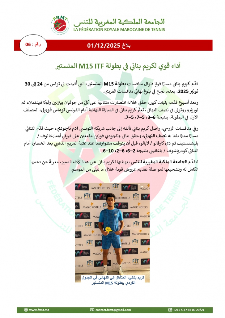 Solide performance de Karim Bennani au tournoi ITF M15 Monastir
