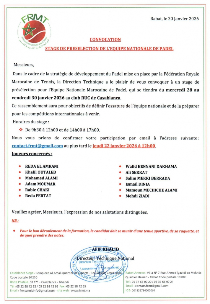 Stage de présélection de l’équipe nationale de Padel