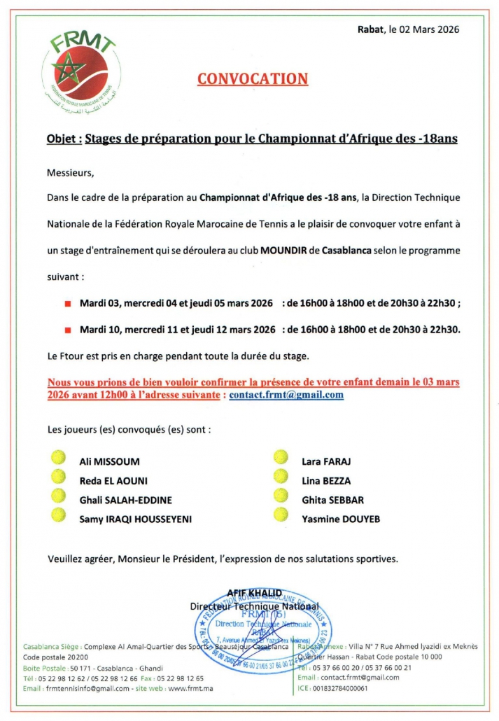 Stages de préparation pour le Championnat d’Afrique des U18